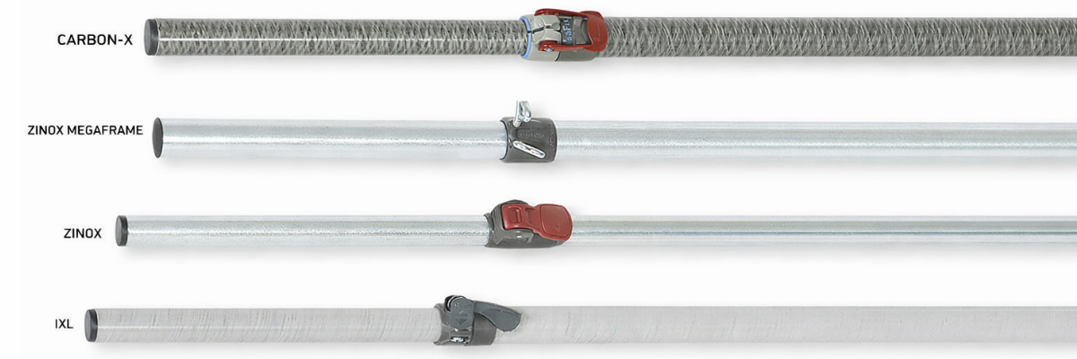 Zinox-stålrörsstativ kan användas både för rese- och säsongscamping. Stålstativet är ett billigare alternativ och en utmärkt ersättning för CarbonX och MegaFrame. För resecamping är Zinox ett något tyngre stativ att ta med, men ändå lätt att hantera eftersom den har T-Rex-låsbeslag som spänner stängerna med ett enkel tryck på handtaget. Zinox-stålstativ är också lämplig för säsongscamping. Stativet består av samma material som MegaFrame, men har mindre diameter och hörn och kors i formgjuten plast. Zinox-stålstativ är extra lämplig för camping under lågsäsong, och därför är det också det stativ du hittar i våra Universal- och vintertält.
