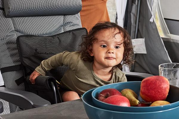 The mini chair lifts the child up to table height so they can sit at mealtimes. The mini chair can also be used as a small independent chair. When not in use, it folds easily and takes up very little space.
