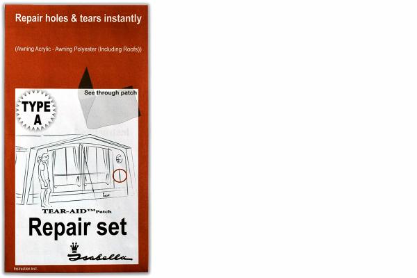 TearAid™ repair kit - Type A. Isabella repair kit for awnings. The patches are transparent. Type A is for Acrylic, such as canvas. Also available in Type B for PVC.