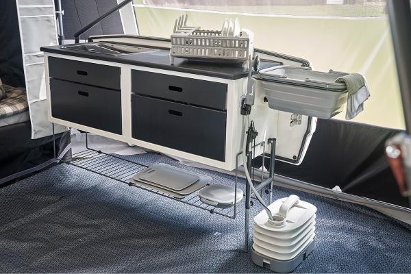 Keittiö Deluxe on suunniteltu 2 kaasupolttimella. Työtason alla on kaksi tilavaa säilytyslokeroa, kaksi toiminnallista ulosvedettävää laatikkoa ja hylly, jotka sopivat erinomaisesti astioiden ja keittoastioiden järjestämiseen ja pitämiseen helposti saatavilla. Keittiössä on myös 10 litran kokoontaitettava vesisäiliö ja kokoontaitettava tiskialtaat, jotka molemmat vievät vain vähän tilaa kuljetuksen ja säilytyksen aikana. Sähköinen vesipumppu, jossa on hanat ja suihkupää USB-latauksella, varmistaa, että sinulla on vettä astioiden pesuun ja suihkuun.