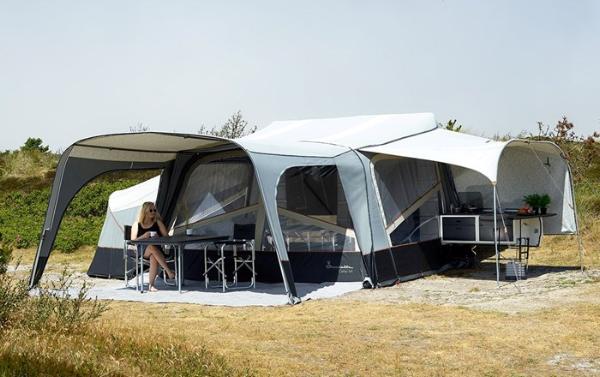 Passion-aurinkopurje kiinnitetään vetoketjulla telttavaunuun ja se tarjoaa sekä varjoa että katettua oleskelutilaa. Tuulensuojaa tarvittaessa aurinkopurjeeseen voidaan kiinnittää verhoilla varustetut sivuseinät.