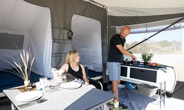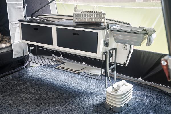 Keittiö All Round on suunniteltu 2 kaasupolttimella. Työtason alla on kaksi tilavaa säilytyslokeroa ja hylly, jotka sopivat erinomaisesti astioiden ja keittoastioiden järjestämiseen ja pitämiseen helposti saatavilla. Keittiössä on myös kokoontaitettava 10 litran vesisäiliö ja kokoontaitettava tiskialtaat, jotka molemmat vievät vain vähän tilaa kuljetuksen ja säilytyksen aikana. Sähköinen vesipumppu, jossa on hanat ja suihkupää USB-latauksella, varmistaa, että sinulla on vettä astioiden pesuun ja suihkuun.