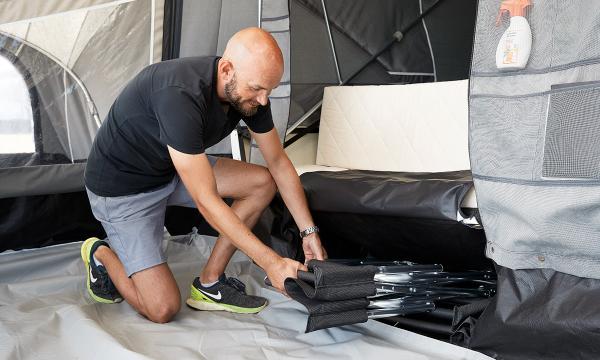 Tavaratila asennetaan Camp-letin makuuosastojen alle. Vasemmalla puolella tavaratilassa on pohja, ja se sopii matkatavaroille, jotka haluat pitää kuivina.